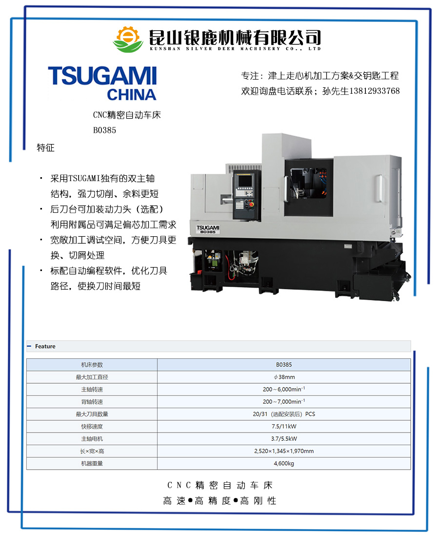 津上目前在产最大直径之走心机,适用直径8-38mm,主轴7.5-11KW电机,背轴3.7/5.5KW,配套刚性高。对长轴类大直径产品实现自动化批量加工。机床整体重达4600kg;比较专业细节的部分,面谈。