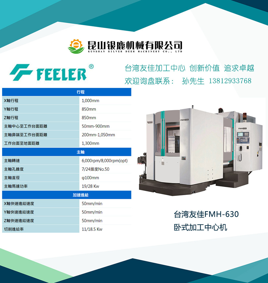 台湾友嘉FMH-630双台面卧式加工中心,设计理念在高效率、稳定、重切削之具体表现。可以承接模具、大型工件加工。针对一般精密工件或是模具加工,都可胜任。稳固高刚性结构,特殊高低轨设计,底座采用T型一体式三层箱形结构设计,配合铸件内部优化的肋骨强化,发挥机械刚性与稳定性;门型双重壁之立柱结构,刚性稳固,保证重切削之需;底座采用高低轨设计,有效缩短力流线,并且提高加工稳定性。工作台配置大锥面托板定位拉栓,定位精密、保证加工精度。配备旋转式自动交换工作台,最大荷重1200KG,工作台最大直径950mm,最快交换速度10秒。链条式刀库,60、80、90、120刀位备选。