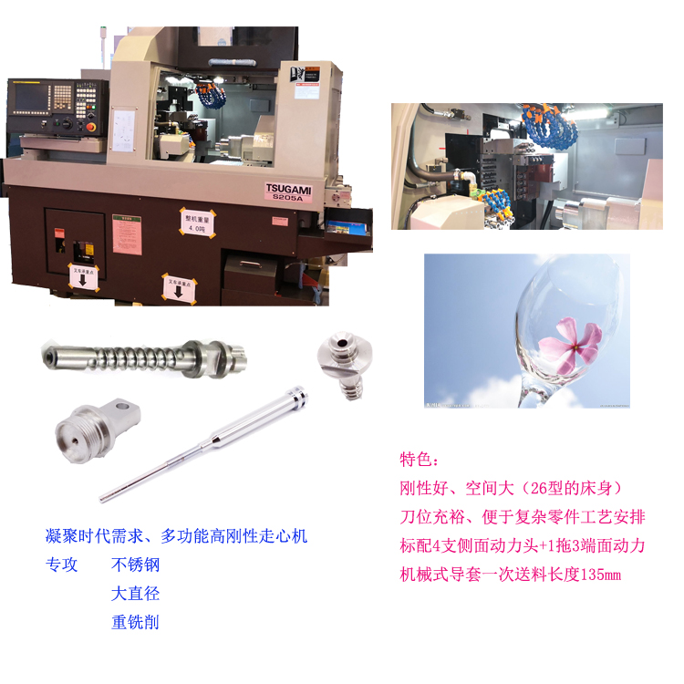 日本津上S205A-III专攻不锈钢、钛合金、大直径、重铣削零件量产加工。新一代医疗精密五金用走心机,搭配4支侧面动力头以及2支可插拔动力接口,可以选装1拖3的双向端面动力头或者1拖3端面斜孔动力头,新型机械式旋转导套一次送料长度达到135mm,并可以视实际需求选配电导套达到210mm一次送料长度。可以为医疗精密五金行业客户提供产品加工方案以及交钥匙工程服务,为客户优质完成产品保驾护航。欢迎垂询!